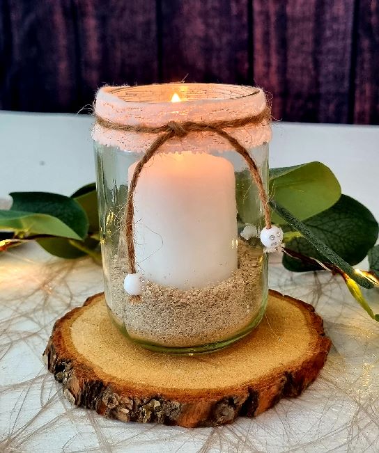 Windlicht mit weißem Spitzenband oben, Kordel mit weißen Glitzerperlen