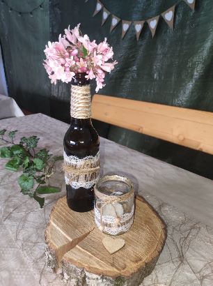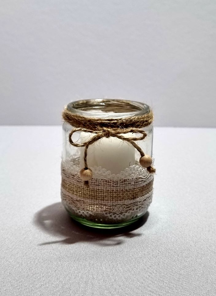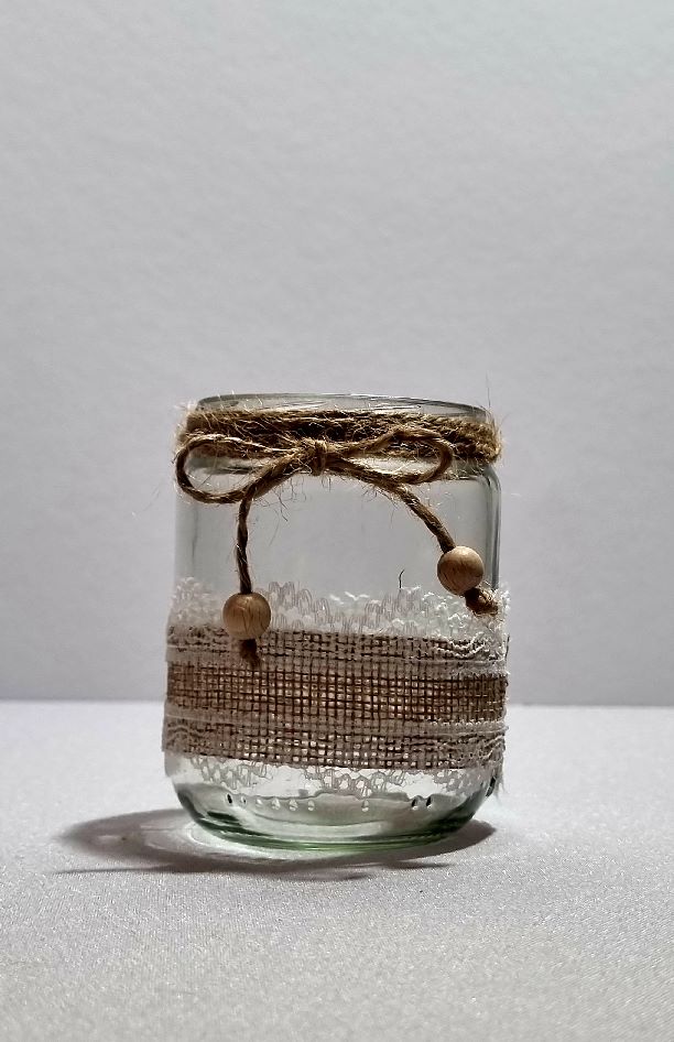 Vintage Windlicht mit rustikaler Spitze und Kordel mit Holzperlen